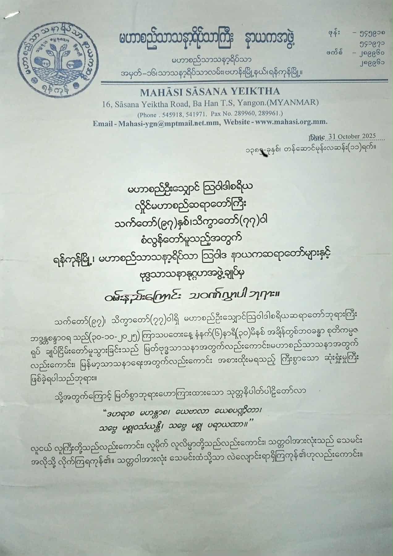 (31.10.2025)ရန်ကုန်မြို့ ၊ မဟာစည်သာသနာ့ရိပ်သာ သြဝါဒ နာယကဆရာတော်များနှင့် ဗုဒ္ဓသာသနာနုဂ္ဂဟအဖွဲ့ချုပ်မှ ဝမ်းနည်းကြောင်း သဝဏ်လွှာပါဘုရား